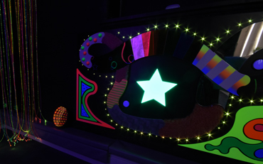 The dark room has the option for colourful images to be projected onto the walls and ceiling and for the use of UV flood lighting. This light allows fluorescent items in the room to glow in the dark.