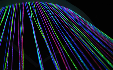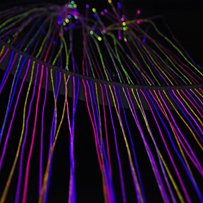 One corner of the room has a fibre optic curtain in a quarter circle shape that allows users to sit behind the fibres and enjoy the sensory effect. The fibres are safe to touch, there is no electricity present in the curtain strands. The curtain has a mirror canopy that supports the fibre optic effect. As users look up, they see the colourful fibres reflected, appearing twice as long as they actually are. As the fibres are UV reactive, they will glow brightly when the UV flood light is active.